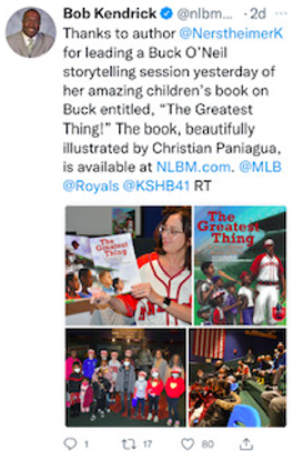 August 21, 2022: Interview with Kaye McIntrye for KPR Presents. She tries to interview all Kansas Notable winners. I am a huge NPR fan so this was so exciting! Click to listen: https://kansaspublicradio.org/show/programs-kpr-presents/2022-10-06/kpr-news-kpr-presents-greatest-thing-story-about-buck-oneil